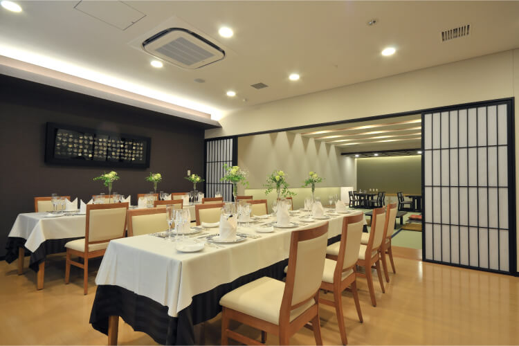 親族控室は、ダイニング・和室・ベッドルーム(2部屋)・バスルーム(2ヶ所)を完備。 通夜会食は、専任のシェフがその季節の旬の食材を生かしたコース料理をご用意。 ダイニングで召し上がっていただきます。 遠方からお越しいただく僧侶様、またご親族が多いご葬家のために 僧侶様控室には、壁面収納ベッドも設置しております。 少人数の家族葬から、一般的なご葬儀まで対応可能なやわらぎ新川別邸。 ご家族や親しい方々とゆったりと安心してお過ごしいただけるよう、
